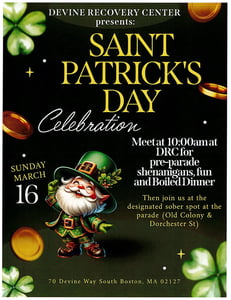 South Boston’s Devine Recovery Center (DRC) is hosting a sober Saint Patrick’s Day event. Participants are meeting at DRC at 10:00 a.m. for pre-parade activities and fellowshipping. After, everyone will head to the designated sober parade spot at Old Colony & Dorchester.