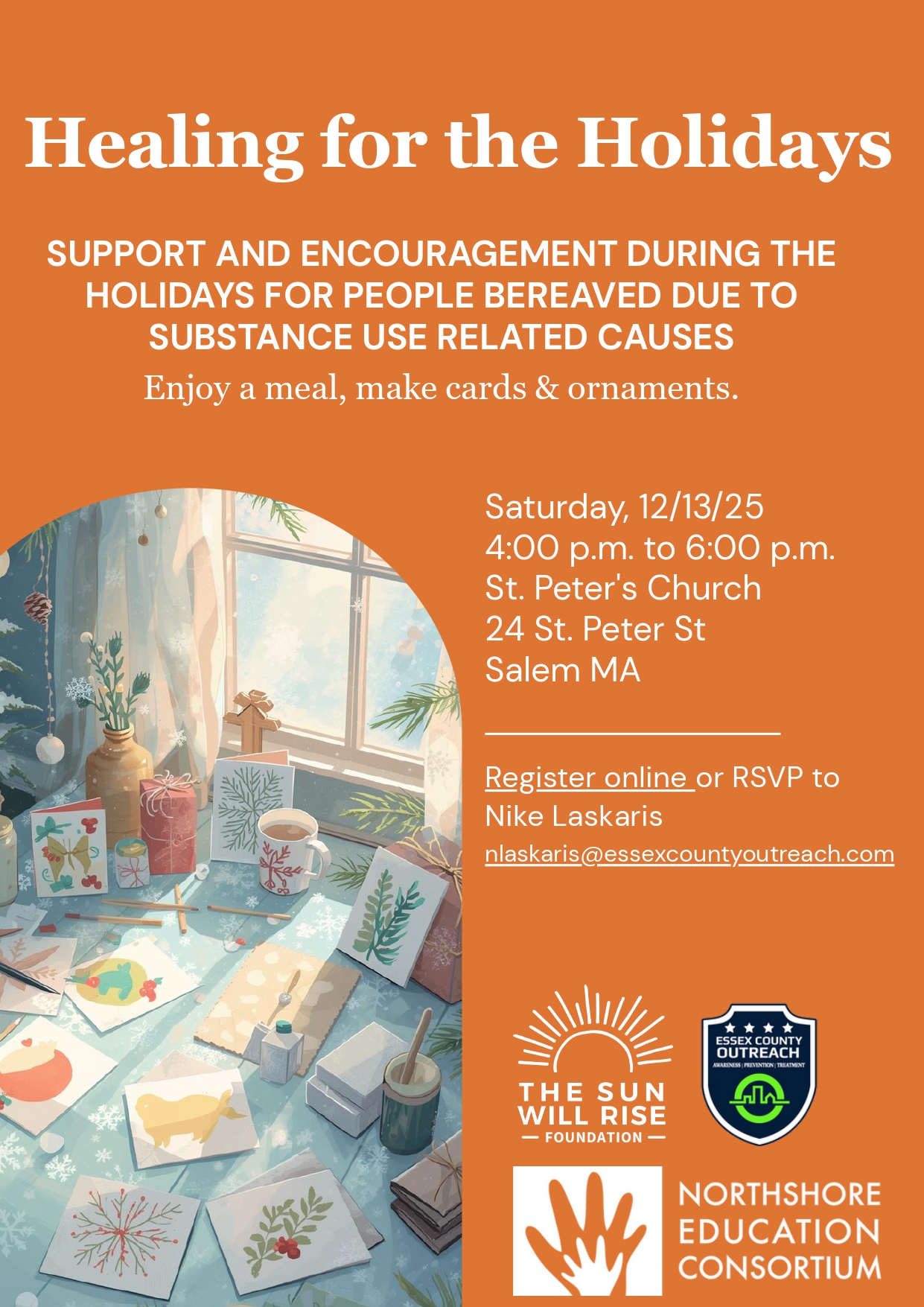 24 St Peter Street, Salem, MA 24 St Peter Street, Salem, MA, United StatesPlease join us this December for a special afternoon of community, healing, and remembrance for those who have lost someone to substance-related causes. Together, we’ll create holiday ornaments and write...