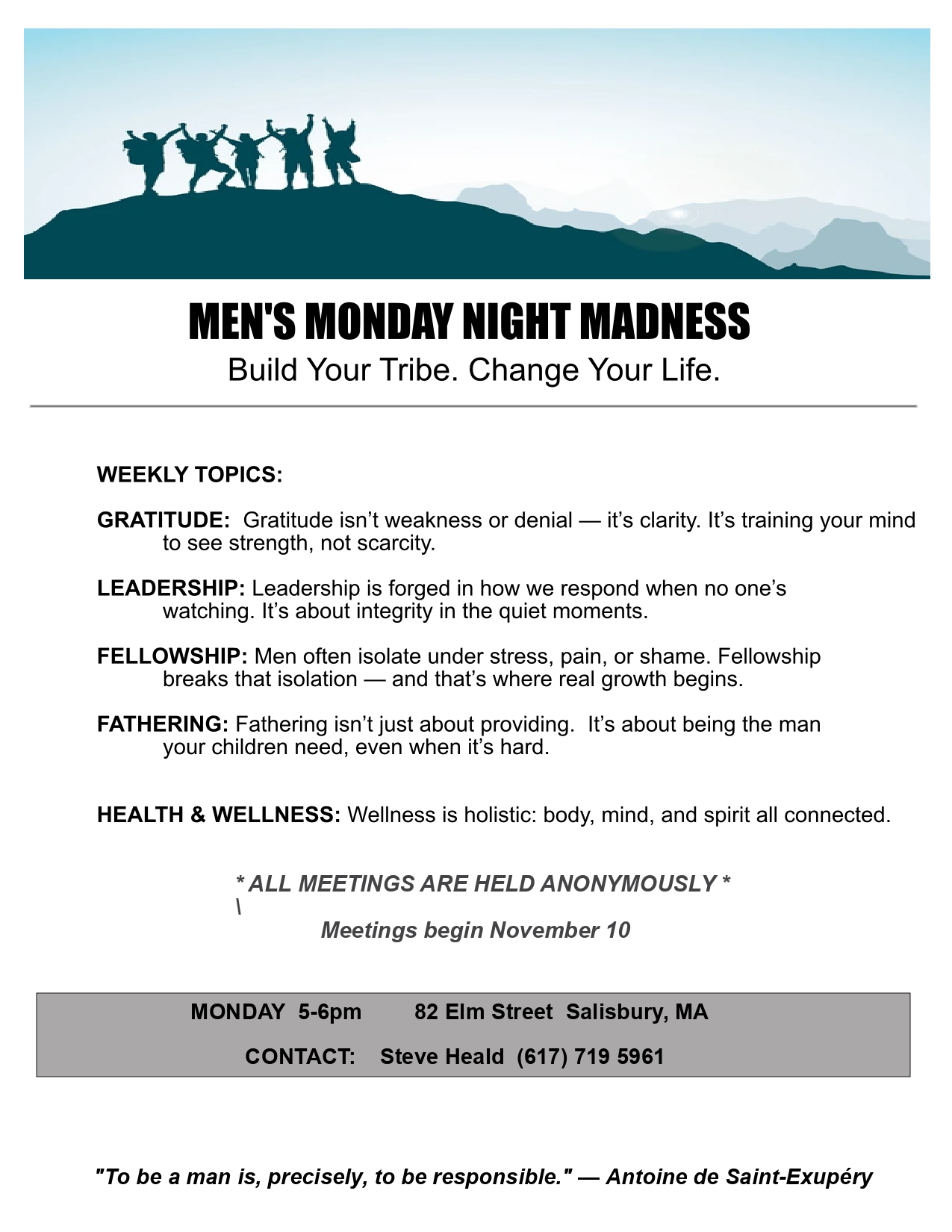 Men's Monday Night Madness offers men in the community a confidential space for connection, reflection, and personal growth. The meetings will be held every Monday from 5:00 to 6:00 PM at the ECO...