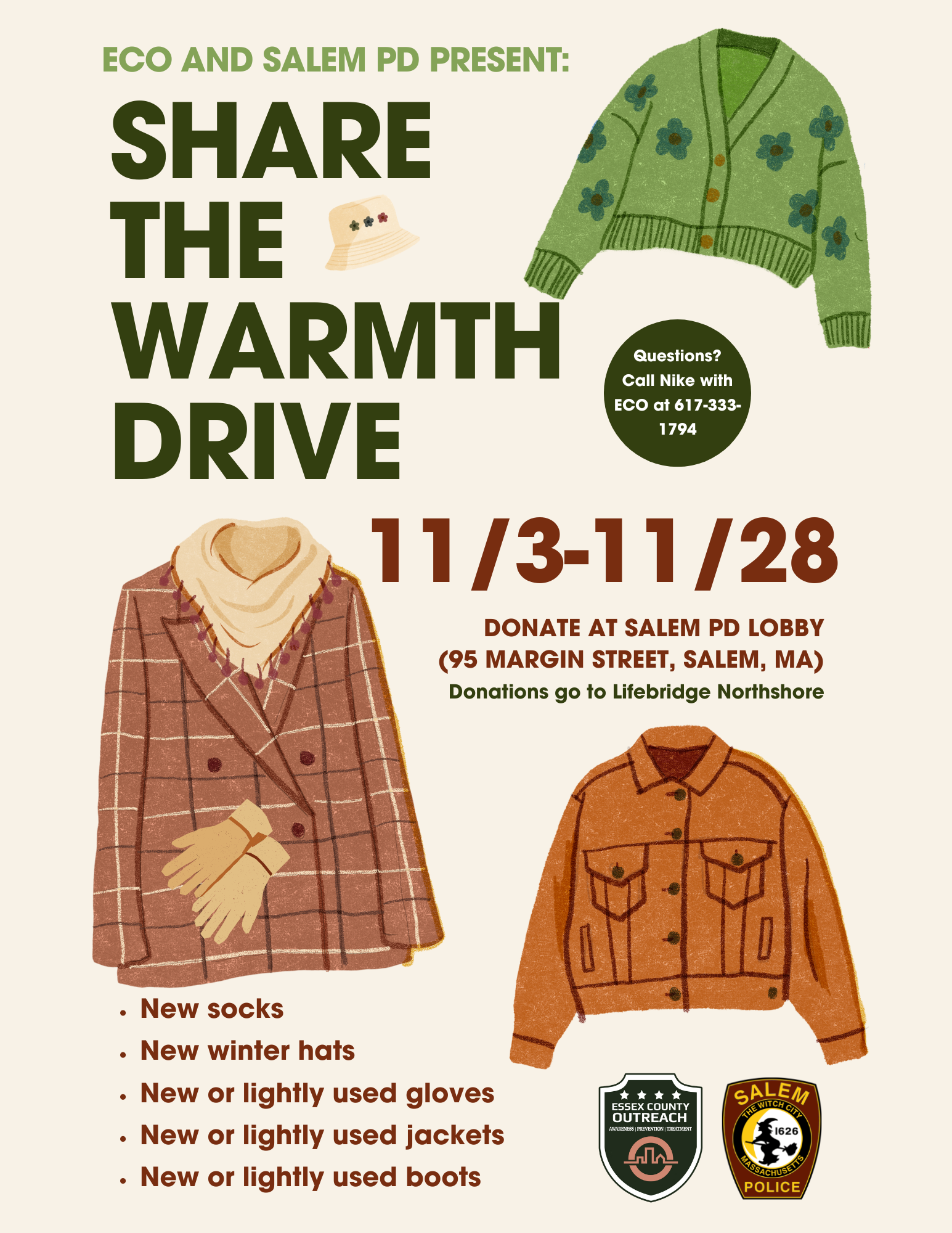 ECO and Salem PD are partnering up for National Homelessness Awareness Month. Stop by the station from November 3rd to November 28th with new socks, winter hats, new/lightly used gloves, jackets, and/or boots. Donations go to Lifebridge Northshore. |
